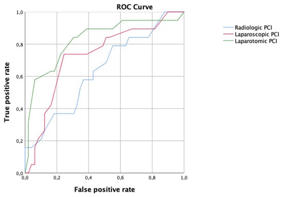 Receiver operating characteristic (ROC) curve comparing radiologic (blue line), laparoscopic (red line) and laparotomic (green line) peritoneal cancer index (PCI) in women who underwent primary debulking surgery.