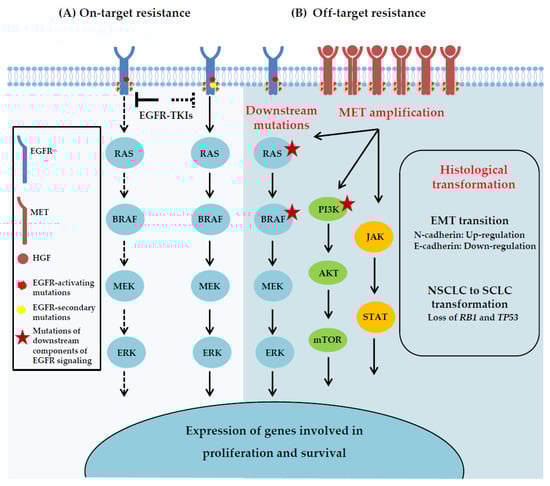 Acquired resistance mechanisms to EGFR-TKIs. (A) On-target resistance is caused by second-site EGFR kinase domain mutations that interfere with the binding of the EGFR-TKIs. (B) Off-target resistance may result from alterations involving downstream components of the EGFR pathway, activation of alternative signaling pathways that bypass the primary drug targets, including MET amplification, or transition to another cell lineage, such as epithelial-to mesenchymal transition (EMT) and SCLC transformation.