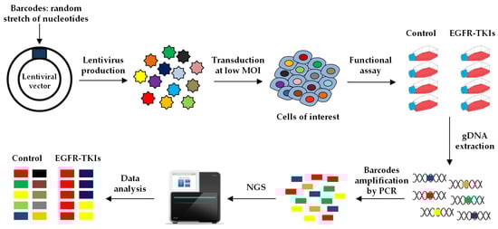 To study the fate of cancer cells in response to treatment, lentiviral vectors can be used to efficiently deliver thousands to millions barcodes that are integrated into the genome of the cells. The barcode corresponds to a highly complex stretch of nucleotides that is inserted in a particular region of the vector. The vectors, each containing a different barcode, are pooled to form a library that can be used to transduce the cells of interest. In the case of completely degenerated sequences, the possible combinations are equivalent to 4N, where N stands for the number of nucleotides. For example, a 20 bp sequence can yield 420 (~1012) unique barcodes. To avoid the generation of aberrant sequences, such as long repeats or highly unbalanced proportions of G/C or A/T, semi-random pools of DNA barcodes can also be designed, in which certain positions are constrained to one or more specific nucleotides. To ensure that each cell contains only one copy of the vector, and hence one barcode, the lentiviral library is transduced at low multiplicity of infection (MOI), followed by selection of the infected cells, generally using an antibiotic, for which the vector encodes a resistance gene. The barcodes can be “read” by amplifying by PCR the corresponding sequence of the vector from the gDNA of the cells, followed by high-throughput sequencing of the amplicon (Figure 4) [109,110].
