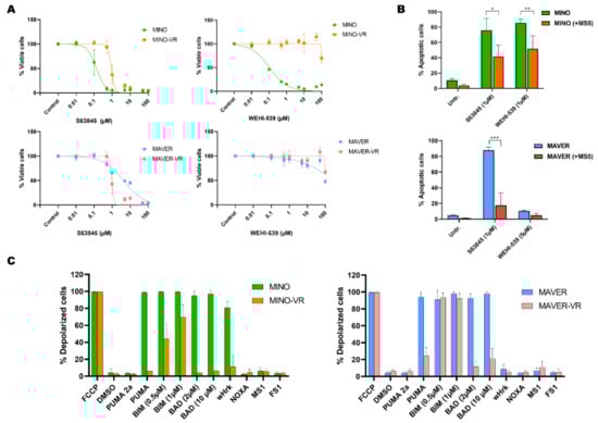 We first determined whether the resistant phenotype was confined to venetoclax or whether it also affected other anti-apoptotic BH3 family members, such as MCL-1 or BCL-XL. The MINO-VR cells also showed decreased sensitivity to the MCL-1 inhibitor S63845 (while MAVER-VR were slightly more sensitive to S63845), as well as the BCL-XL inhibitor WEHI-539, although resistance to BCL-XL inhibition was evident already in the parental MAVER-1 (Figure 2A and Table S2). This combined BH3 family resistance was also observed in the co-culture-mediated venetoclax resistance. Treatment with 1 µM S63845 and 1 µM WEHI-539 led to a significantly lower apoptotic response in MINO and MAVER co-cultured with MS5 (Figure 2B). Thus, both acquired and induced venetoclax resistance were not specific for venetoclax, but potentially associated with reduced apoptotic priming to all three antiapoptotic BH3 proteins.