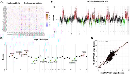 Figure 1. (A) The heatmap of the shallow WGS for 40 EOC patients and 20 healthy subjects. Amplified genomic regions are shown in red, and deleted genomic regions are presented in blue. These regions are based on window Z-score calculations. (B) Genome-wide scatter plot using the Z-scores (OC11). Scatter plot using the Z-scores with the bins for the segmented genome set to 100,000 bases. Red are the segments with copy gain, and green are those with copy loss. (C) Target gene scatter plot using the Z-scores (OC11). Scatter plot using the Z-scores of the target genes for each sample (red circle, Z-score ≥ 2; green circle, Z-score < 2; black circle, other). (D) Correlation plot using an in-silico method. Downsampling of the reads of the original data to 1X. The correlation was calculated using the Z-scores of the target genes.