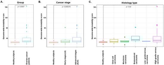 Figure 2. Distribution of genome-wide instability scores according to participant type (A) (OC patients vs. healthy subjects), (B) cancer stage (stages I/II [early] vs. stages III/IV [advanced]), and (C) histology type.