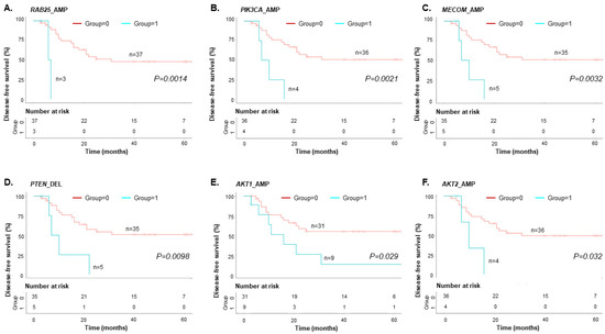 Figure 3. Kaplan–Meier analysis for EOC patient DFS (n = 40). (A) RAB25 amplification (RAB25_AMP), (B) PIK3CA_AMP, (C) MECOM_AMP, (D) PTEN deletion (PTEN_DEL), (E) AKT1_AMP, and (F) AKT2_AMP had a significantly worse DFS (p < 0.05, log-rank test).