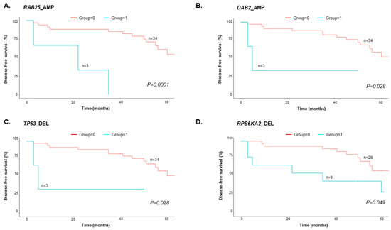 Figure 4. Kaplan–Meier analysis of EOC patient OS (n = 37). (A) RAB25_AMP, (B) DAB2_AMP, (C) TP53_DEL, and (D) RPS6KA2_DEL had significantly worse OS (p < 0.05, log-rank test).
