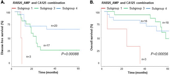 For the DFS, the six genes with CNVs (RAB25, PIK3CA, MECOM, PTEN, AKT2, and RPS6KA2) and CA125 (subgroup 1) had the shortest DFS rate of the four subgroups (p < 0.05) (Figure 5A and Figure S3). In contrast, all six genes without CNVs and CA125 (subgroup 4) had the longest DFS rate (p < 0.05). For subgroup 2, only five genes contained CNVs (PIK3CA, MECOM, PTEN, AKT2, and RPS6KA2). These genes had the second shortest DFS rate. Subgroup 3 had the third shortest DFS rate. We performed OS analysis using the six genes from the DFS analysis. The results showed that only “RAB25_AMP and CA125 > 575.5 U/mL” had the shortest OS survival rate reaching statistical significance (p = 0.00056) (Figure 5B).