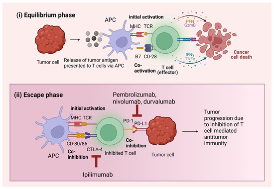 Tumor behavior in the presence and absence of ICIs. (i) Tumor cells in the equilibrium phase do not survive due to the presence of initial as well as co-activation markers. (ii) Tumor progresses due to the absence of co-activation. Initial activation is present along with co-inhibition mediated by immune checkpoints. The ICIs are antibodies targeting these immune checkpoints, such as pembrolizumab, nivolumab, durvalumab, and ipilimumab. Abbreviations: APC: antigen presenting cells, MHC: major histocompatibility complex, TCR: T cell receptor, CD: cluster of differentiation, PFN: pore forming granule protein perforin, GzmB: granzyme B, IFN: interferon, TNF: tumor necrosis factor, CTLA: cytotoxic T lymphocyte associated antigen, PD-1: programed cell death receptor, PD-L1: programed cell death ligand.