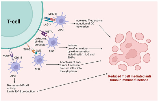 Immune checkpoints other than PD-1 and CTLA-4. Various immune checkpoints that are expressed on T cells following binding to their particular ligands lead to a series of immunosuppressive reactions that ultimately suppress the anti-tumor immune activity of functional T cells. Abbreviations: APC: antigen presenting cells, CD: cluster of differentiation, DC: dendritic cells, Gal9: Galectin-9, IL: interleukin, MHC: major histocompatibility complex, LAG-3: Lymphocyte activation gene-3, TIGIT: T Cell Ig and Immunoreceptor Tyrosine-Based Inhibitory Motif Doman, TIM-3: T Cell Immunoglobulin and Mucin-Containing Protein 3, VISTA: V-Domain Ig Suppressor of T Cell Activation.