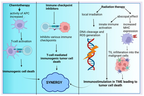 The rationale of combining ICIs with radiation and chemotherapy. This shows the influence of the immune system on the mechanism of conventional therapies. Though immune mediated tumor death is not the major mechanism for the antitumor effects of these conventional therapies, there is some amount of involvement of immune mediated mechanisms. This provides a rationale for combining immunotherapy with chemotherapy and radiation, as this might provide synergistic effects. Abbreviations: APC: antigen presenting cells, DNA: deoxy-ribo-nucleic acid, MHC: major histocompatibility complex, TIL: tumor infiltrating lymphocytes, TME: tumor microenvironment.