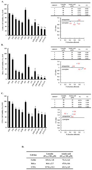 Luteolin and asiatic acid inhibited the proliferation of cervical cancer cell lines. CaSki (A), HeLa (B) and C33A (C) cell proliferation was measured using a CCK-8 assay after cells were exposed to Lut or AsA alone or in combination. (D) IC50 values for luteolin and asiatic acid treatments in cervical cancer cells. Values represent mean ± SD from three replicates. *, †, **, £, δ and γ p ˂ 0.05 compared with CON, L50-, L75-, A25-, A50- or A75-treated group. CON, 0.1% DMSO; L10, 10 μM luteolin; L50, 50 μM luteolin; L75, 75 μM luteolin; L100, 100 μM luteolin; A25, 25 μM asiatic acid; A50, 50 μM asiatic acid; A75, 75 μM asiatic acid. CI, combination index, IC50, half maximal inhibitory concentration. G1, 50 μM luteolin + 25 μM asiatic acid; G2, 50 μM luteolin + 50 μM asiatic acid; G3, 50 μM luteolin + 75 μM asiatic acid; G4, 75 μM luteolin + 75 μM asiatic acid; blue mark, combination index values.