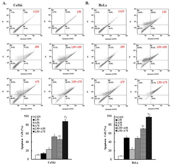 The combination of luteolin and asiatic acid induced greater apoptosis in CaSki and HeLa cells. CaSki and HeLa cells were analyzed using flow cytometry after 24 h of treatment with Lut (50 μM) or AsA (50 and 75 μM) alone or in combination. Representative flow cytometry dot plots (upper panel) and histograms (lower panel) reveal cell apoptosis (Annexin V- and PI-stained cells) and quantitative analysis for (A) CaSki and (B) HeLa cells. Values represent mean ± SD from three replicates. *, †, δ and γ p ˂ 0.05 compared with CON, L50-, A50- or A75-treated group. CON, 0.1% DMSO; L50, 50 μM luteolin; A50, 50 μM asiatic acid; A75, 75 μM asiatic acid. L50 + A50, 50 μM luteolin + 50 μM asiatic acid; L50 + A75, 50 μM luteolin + 75 μM asiatic acid.