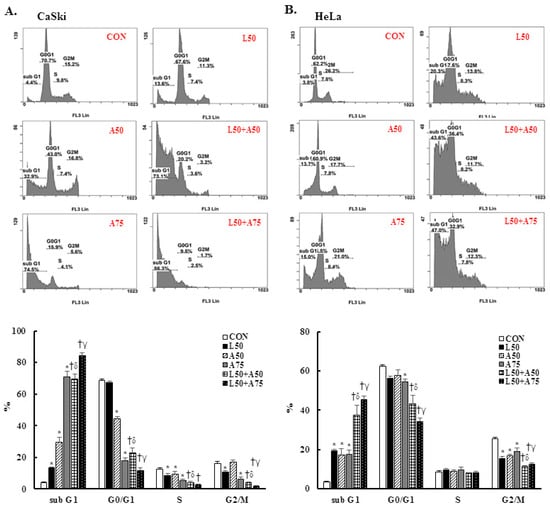 The combination of luteolin and asiatic acid led to cell cycle arrest in the sub-G1 phase in CaSki and HeLa cells. CaSki and HeLa cells were analyzed using flow cytometry after 24 h of treatment with Lut (50 μM) or AsA (50 and 75 μM) alone or in combination. Representative flow cytometry results (upper panel) and histograms (lower panel) reveal the cell cycle distribution (sub-G1, G0/G1, S and G2/M) and quantitative analysis for (A) CaSki and (B) HeLa cells. Values represent mean ± SD from three replicates. *, †, δ and γ p ˂ 0.05 compared with CON, L50-, A50- or A75-treated group. CON, 0.1% DMSO; L50, 50 μM luteolin; A50, 50 μM asiatic acid; A75, 75 μM asiatic acid. L50 + A50, 50 μM luteolin + 50 μM asiatic acid; L50 + A75, 50 μM luteolin + 75 μM asiatic acid.