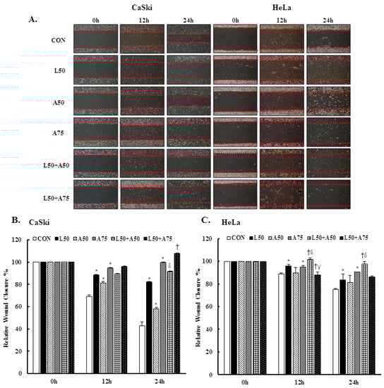 CaSki and HeLa cells were cultured in 6-well plates with 1 × 106 cells per well to form a confluent monolayer and straight wounds were made by scratching with a 200-μL pipette tip. After washing with medium to remove cell debris, the wounded monolayers were treated with 50 μM Lut with or without 50 or 75 μM AsA for 0, 12 and 24 h. The wound gaps were photographed at regular intervals (0, 12 and 24 h) under an Olympus BX61 microscope (Olympus Corporation, Shinjuku, Tokyo, Japan) at 100× magnification, and the cell-free wound areas were measured using ImageJ software (http://rsb.info.nih.gov/ij, accessed on 11 May 2022, NIH, Bethesda, MD, USA). To reduce variability in the results, multiple views of each well were documented, and wound closure was evaluated as a percentage relative to the untreated control.