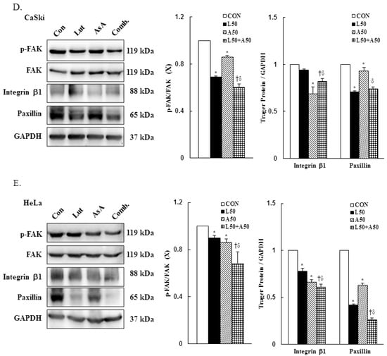 To investigate the cell migration ability of cervical cancer cell lines treated with Lut and AsA, we performed a wound-healing assay. The cells in the untreated control group showed a faster cell migration ability than cells treated with Lut or AsA (Figure 5A–C, p < 0.05). Furthermore, the combination of Lut and AsA markedly inhibited the migration rate of CaSki and HeLa cells as compared with treatment with Lut or AsA alone at 12 and 24 h, although the combination with a higher dose of AsA in CaSki and HeLa cells did not. As integrin/FAK/paxillin has been reported to cause tumor migration and invasion, we next examined these modulated cell migration-related protein expressions by western blotting. Lut or AsA monotherapy significantly decreased the phospho-FAK (ratio of control: 0.69 ± 0.01 vs. 0.86 ± 0.01), integrin β1 (ratio of control: 0.94 ± 0.01 vs. 0.69 ± 0.07) and paxillin (ratio of control: 0.71 ± 0.01 vs. 0.93 ± 0.04) protein expression levels in CaSki cells, while for HeLa cells, the expressions of phospho-FAK, integrin β1 and paxillin were reduced (ratio of control: 0.90 ± 0.02 vs. 0.86 ± 0.03, 0.78 ± 0.03 vs. 0.66 ± 0.03, 0.42 ± 0.01 vs. 0.63 ± 0.02, respectively, Figure 5D,E and Figure S2, p < 0.05). Lut and AsA co-treatment more significantly decreased the phospho-FAK, integrin β1 and paxillin protein expressions (CaSki cells, ratio of control: 0.60 ± 0.03 vs. 0.82 ± 0.03 vs. 0.74 ± 0.02; HeLa cells, ratio of control: 0.68 ± 0.1 vs. 0.61 ± 0.03 vs. 0.26 ± 0.02, respectively). These results clearly suggested that Lut combined with AsA inhibited cancer cell migration by decreasing the integrin/FAK/paxillin signaling pathway.