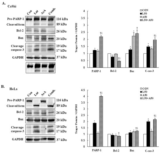 To further confirm our prior results showing that Lut and AsA treatment induced cervical cancer cell death by apoptosis, apoptosis-related proteins expressions were determined by western blotting. The western blotting findings revealed that Lut or AsA treatment significantly increased the expressions of cleaved PARP-1, pro-apoptotic protein Bax and cleaved caspase-3, whereas anti-apoptotic protein Bcl-2 was significantly decreased in expression as compared with the control in CaSki and HeLa cervical cancer cells (CaSki cells, ratio of control: 1.23 ± 0.03 vs. 1.17 ± 0.01, 1.28 ± 0.1 vs. 2.23 ± 0.25, 1.48 ± 0.09 vs. 1.32 ± 0.05, 0.76 ± 0.05 vs. 0.97 ± 0.01; HeLa cells, ratio of control: 1.88 ± 0.03 vs. 1.05 ± 0.12, 1.11 ± 0.04 vs. 1.19 ± 0.03, 1.99 ± 0.12 vs. 1.21 ± 0.06, 0.92 ± 0.04 vs. 0.87 ± 0.03, respectively). Moreover, Lut and AsA co-treatment more significantly upregulated the cleaved PARP-1, Bax and cleaved caspase-3 expressions, and downregulated the Bcl-2 expression (CaSki cells, ratio of control: 2.18 ± 0.08 vs. 2.41 ± 0.23 vs. 1.96 ± 0.15 vs. 0.47 ± 0.02; HeLa cells, ratio of control: 4.0 ± 0.1 vs. 1.25 ± 0.03 vs. 2.16 ± 0.10 vs. 0.83 ± 0.04, respectively) as compared with Lut or AsA monotherapy, although no significant differences were observed in the Bax expression in CaSki cells and Bcl-2 expression in HeLa cells compared with AsA monotherapy (Figure 6 and Figure S3, p < 0.05). Taken together, these findings showed that Lut and AsA induced pro-apoptotic effects in CaSki and HeLa cells through a mitochondria-related intrinsic signaling pathway.