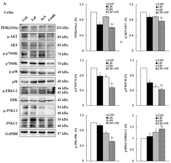 Luteolin combined with asiatic acid induced apoptosis through inhibition of PI3K/AKT and regulation of MAPKs pathways in cervical cancer cells. Western blotting was used to detect PIK3CA, p-AKT, AKT, p-70S6K, 70S6K, p-p38, p38, p-ERK1/2, ERK1/2, p-JNK1/2 and JNK1/2 levels in CaSki (A) and HeLa (B) cells treated with Lut (50 μM) or AsA (50 μM) alone or in combination for 24 h. GAPDH served as the loading control. Quantitative results are shown in the lower plot. Values represent mean ± SD from three replicates. *, † and δ p ˂ 0.05 compared with CON, L50- or A50-treated group. CON, 0.1% DMSO; L50, 50 μM luteolin; A50, 50 μM asiatic acid; Comb., 50 μM luteolin + 50 μM asiatic acid.