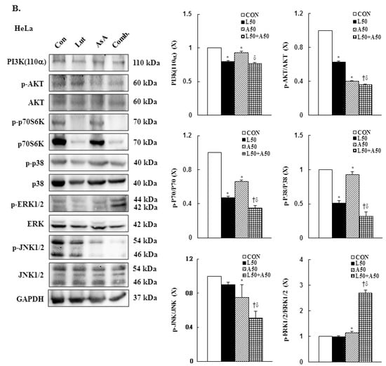 To further to understand the molecular mechanism of Lut- and AsA-induced apoptosis in cervical cancer cells, the phosphorylation statuses of PI3K(p110α), AKT, p70S6K, p38, ERK1/2 and JNK1/2 were determined by western blotting. In CaSki cells, Lut or AsA monotherapy significantly decreased phosphorylation of PI3K(p110α), AKT, p70S6K, p38 and JNK1/2, while significantly increasing phosphorylation of ERK1/2, as compared with the control (ratio of control: 0.68 ± 0.02 vs. 0.88 ± 0.01, 0.87 ± 0.03 vs. 0.88 ± 0.01, 0.78 ± 0.04 vs. 0.76 ± 0.03, 0.61 ± 0.03 vs. 0.50 ± 0.02, 0.93 ± 0.01 vs. 0.73 ± 0.01, 1.09 ± 0.14 vs. 1.27 ± 0.09, respectively). Similar results were observed for HeLa cells, with Lut or AsA monotherapy significantly decreasing PI3K(p110α), p-AKT, p-p70S6K, p-p38 and p-JNK1/2 and significantly increasing the p-ERK1/2 protein expression level (ratio of control: 0.80 ± 0.01 vs. 0.93 ± 0.02, 0.63 ± 0.01 vs. 0.40 ± 0.01, 0.47 ± 0.02 vs. 0.66 ± 0.02, 0.51 ± 0.04 vs. 0.93 ± 0.04, 0.90 ± 0.03 vs. 0.75 ± 0.15, 0.98 ± 0.04 vs. 1.14 ± 0.05, respectively), although no significant difference were observed the p-JNK1/2 expression (ratio of control: 0.90 ± 0.03) in HeLa cells and p-ERK1/2 expression in both CaSki and HeLa cells after Lut monotherapy (ratio of control: 1.09 ± 0.14 vs. 0.98 ± 0.04, respectively; Figure 7, Figures S4 and S5, p < 0.05). Moreover, combination treatment with Lut and AsA more significantly decreased the PI3K(p110α), p-AKT, p-p70S6K, p-p38 and p-JNK1/2 expressions, and more synergistically increased the p-ERK1/2 expression level in both CaSki and HeLa cells (CaSki cells, ratio of control: 0.60 ± 0.01 vs. 0.77 ± 0.01 vs. 0.48 ± 0.03 vs. 0.43 ± 0.03 vs. 0.51 ± 0.02 vs. 1.42 ± 0.06; HeLa cells, ratio of control: 0.77 ± 0.01 vs. 0.36 ± 0.01 vs. 0.35 ± 0.03 vs. 0.32 ± 0.06 vs. 0.51 ± 0.08 vs. 2.69 ± 0.13, respectively), as compared with Lut or AsA alone. These results confirmed that Lut- and AsA-induced apoptosis in cervical cancer cells might involve the PI3K/AKT/p70S6K and p38/ERK1/2/JNK1/2 pathways.