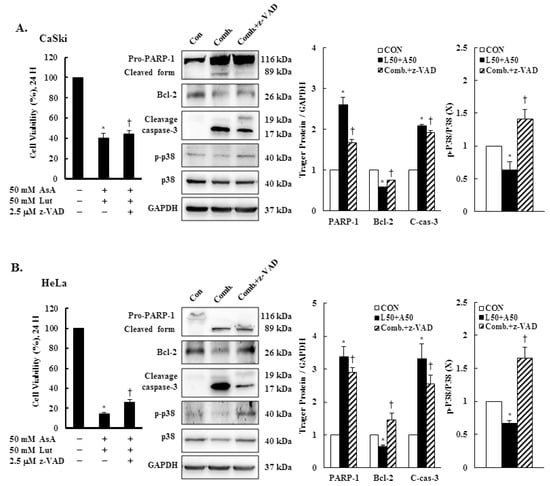 z-VAD-fmk altered apoptosis-related protein expressions. CaSki and HeLa cells were pretreated with z-VAD-fmk (2.5 μM) for 2 h and then treated with or without Lut (50 μM) and AsA (50 μM) for 24 h. CaSki (A) and HeLa (B) cell viabilities were examined using a CCK-8 assay. The expressions of PARP-1, Bcl-2, caspase-3, p-p38 and p38 were detected through western blotting. GAPDH served as the loading control. Quantitative results are shown in the lower plot. Values represent mean ± SD from three replicates. * and † p ˂ 0.05 compared with CON or AsA + Lut-treated group. CON, 0.1% DMSO; Comb., 50 μM luteolin + 50 μM asiatic acid; Comb. + z-VAD, 50 μM luteolin + 50 μM asiatic acid + 2.5 μM z-VAD-fmk.