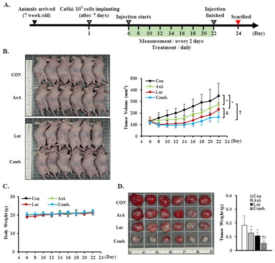 Seven-week-old female BALB/cAnN.Cg-Foxn1nu/CrlNarl (NUDE) mice were purchased from the National Laboratory Animal Center (Taipei, Taiwan). CaSki cells (1 × 107) were mixed with Corning® Matrigel® Matrix reagent (#354248; Corning Inc., Tewksbury, MA, USA) at a 2:1 ratio and injected into the right flank of the mice. Tumor volume (mm3) and body weight were measured using an electronic caliper every two days, using the following standard formula: Volume = [(length) × (width)2]/2. When the tumor volume reached ~130 mm3 (Day 6), the mice were randomly divided into four groups (six mice per group) and drug treatment was initiated via daily intraperitoneal injection (i.p.): vehicle control group [10% DMSO, 40% Cremophor/ethanol (3:1; Sigma-Aldrich) and 50% PBS]; AsA group [100 mg/kg/day, dissolved in 10% DMSO, 40% Cremophor/ethanol (3:1) and 50% PBS]; Lut group (50 mg/kg/day, dissolved in 10% DMSO, 40% Cremophor/ethanol and 50% PBS); and combination group (asiatic acid 100 mg/kg/day plus luteolin 50 mg/kg/day). The mouse tumors were extracted for tissue section preparation and the tumor weight was recorded after sacrifice on day 22. Cancer cell implantation was performed using a 2–3% isoflurane (Panion & BF Biotech) inhalation, and the mice sacrifice was performed using a CO2 chamber. The animal protocols were approved by the Institutional Animal Care and Use Committee (IACUC) of Changhua Christian Hospital, Taiwan (Approval No: CCH-AE-109-020).