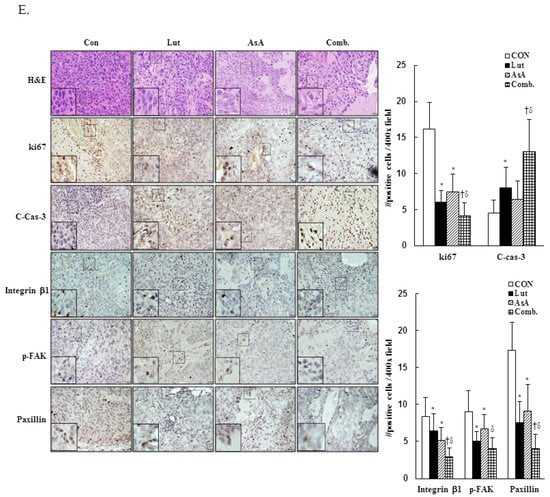To further confirm the in vitro anti-proliferation effects of Lut and AsA, a CaSki xenograft tumor model was constructed in BALB/c nude mice. The schematic timeline of this experiment was as shown in Figure 9A. Lut or AsA markedly inhibited the in vivo tumor growth of CaSki xenografts, particularly Lut combined with AsA. After treatment for 16 days, the average tumor volume of the CaSki xenograft tumors was 349.4 ± 108.7 mm3 vs. 274.1 ± 88.2 mm3 vs. 230.3 ± 58.4 mm3 vs. 165.7 ± 42.6 mm3 in the vehicle control, AsA-, Lut- and Lut plus AsA-treated groups, while the tumor growth inhibition rate was 21.6% vs. 34.1% vs. 52.6%, respectively (Figure 9B, p < 0.05). No significant difference in body weight between groups was observed during the experimental period (21.3 ± 1.4 g vs. 21.4 ± 1.2 g vs. 21.4 ± 0.9 g vs. 21.7 ± 1.5 g, respectively) and the experimental animal survival rate was 100%, suggesting that treatment with Lut and AsA alone or in combination did not cause host drug toxicity (Figure 9C). The average tumor weight was significantly reduced in the AsA-, Lut- and Lut plus AsA-treated groups (0.13 ± 0.03 g vs. 0.11 ± 0.03 g vs. 0.05 ± 0.02 g, respectively) as compared with the control group (0.18 ± 0.07 g, Figure 9D, p < 0.05). Moreover, in performing H&E staining, we found that the Lut plus AsA treatment more effectively reduced the tumor cellularity and apoptosis in the CaSki xenografts than AsA or Lut monotherapy. Similarly, consistent with the in vitro findings in this study, IHC study demonstrated more significantly downregulated expressions of ki67 (4.1 ± 1.8 positive cells), integrin β1 (2.9 ± 1.2 positive cells), p-FAK (4.0 ± 1.5 positive cells) and paxillin (4.0 ± 2.0 positive cells) and an upregulated cleaved caspase-3 (13.0 ± 4.5 positive cells) protein expression in tumors treated with Lut plus AsA as compared with the AsA-, Lut- and control- groups (ki67, 7.5 ± 2.4 vs. 6.0 ± 1.6 vs. 16.2 ± 3.7 positive cells; integrin β1, 5.1 ± 1.8 vs. 6.4 ± 2.3 vs. 8.4 ± 2.6 positive cells; p-FAK, 6.7 ± 1.9 vs. 5.0 ± 1.3 vs. 9.0 ± 2.9 positive cells; paxillin, 9.1 ± 3.6 vs. 7.5 ± 2.9 vs. 17.3 ± 3.8 positive cells; cleaved caspase-3, 6.4 ± 2.6 vs. 8.0 ± 2.9 vs. 4.5 ± 1.8 positive cells, respectively; Figure 9E, p < 0.05). These results further suggested that Lut plus AsA combined treatment acted as an anti-proliferative, anti-migratory and pro-apoptotic agent in vivo.