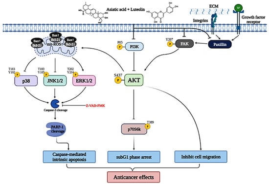 Schematic diagram of luteolin combined with asiatic acid’s anticancer molecular mechanism in cervical cancer. Lut combined with AsA mainly modulates FAK signaling (integrin β1, paxillin and FAK) and PI3K/AKT signaling (PI3K, AKT and p70S6K) and causes JNK/p38 downregulation and ERK upregulation, inactivating or activating various signaling targets, such as Bcl2, Bax, mitROS, caspase-3 and RARP1; this leads to the induction of caspase-mediated intrinsic apoptosis, sub-G1 phase arrest and inhibition of cancer cell migration, which increase the anticancer effect on cervical cancer.