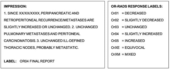 17]. Hence, a group at the Memorial Sloan Kettering Cancer Center recently piloted a novel method, the Oncologic Response Lexicon (OR-RADS), which comprises the following seven distinct response categories: Or01 = decreased, Or02 = slightly decreased, Or03 = unchanged, Or04 = slightly increased, Or05 = increased, OrXE = equivocal, and OrXM = mixed [