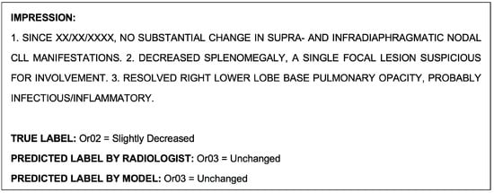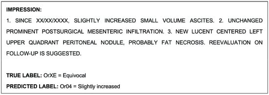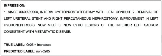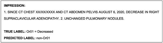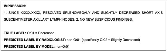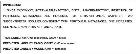 While, in these cases, radiology domain expertise was required to correctly interpret the clinical impression, there were several cases where human classification capabilities were insufficient. Commonly, incorrect radiologist annotations tended to be close to the correct label; for example, a report with the true label “decreased” (Or01) was predicted “slightly decreased” (Or02); alternatively, a report with a pure label (one of Or01 to Or05) was predicted “mixed” (OrXM). Additionally, OrXE, OrXM, and “slightly increased” (Or04) class reports were very commonly incorrectly classified as “increased” (Or05). There are several potential explanations for these incorrect human annotations. Human error caused by fatigue is potentially a factor during retrospective labeling. The imbalance of category labels in the dataset may have also introduced bias. It is also possible for there to have been a drift in the use of the OR-RADS categories by radiologists during the period in which these categories were first developed and used prospectively, compared to more recently at the time that the retrospective human annotations occurred.