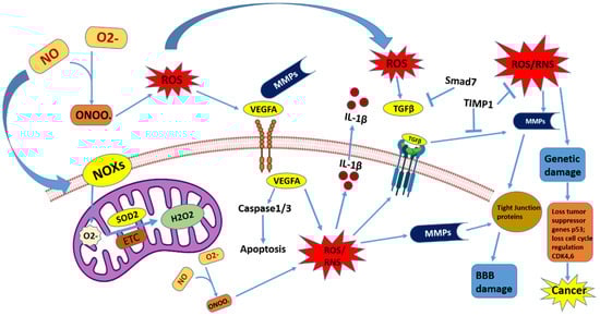 Role of ROS and RNS in genetic damage and BBB damage, causing oxidative stress and cancer in the brain. NOXs in reaction with O2− produce ROS and RNS, in turn activating MMPs (matrix metalloproteinases), which damage the blood–brain barrier (BBB) and cause oxidative stress in the brain. ROS activate VEGFA and TGFβ, which leads in the formation of ROS and RNS. The antioxidant SOD2 catalyzes H2O2, which activates ROS AND RNS and also leads to genetic damage and a loss of the tumor suppressor (p53) and cell cycle regulators (CDK4,6), which leads to cancer activation. Smad7 and TIMP1 act as the inhibitors of ROS AND RNS activity. Abbreviation: ROS—reactive oxygen species; RNS—reactive nitrogen species; BBB—blood–brain barrier; ETC—electron transport chain; MMP—matrix metalloproteinase; SOD2—superoxide dismutase-2; VEGFA—vascular endothelial growth factor A; TGFβ—transforming growth factor-beta; Smad7—suppressor of mothers against decapentaplegic-7; TIMP1—tissue inhibitor of metalloproteinase.