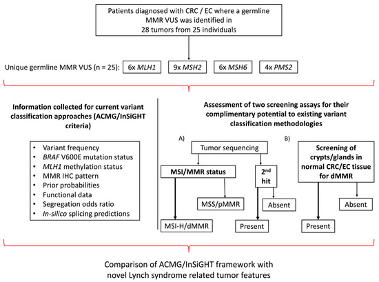 Overview of study design. Schema presenting the study inclusion criteria, the breakdown of the germline MMR VUS distribution and the testing assays applied. Abbreviations: CRC, colorectal cancer; EC, endometrial cancer; MMR, DNA mismatch repair; VUS, variant of uncertain clinical significance; IHC, immunohistochemistry; MSI, microsatellite instability; MSI-H, high levels of microsatellite instability; MSS, microsatellite stable; dMMR, DNA mismatch repair deficiency; pMMR, DNA mismatch repair proficiency; ACMG, American College of Medical Genetics and Genomics; InSiGHT, International Society for Gastrointestinal Hereditary Tumours.