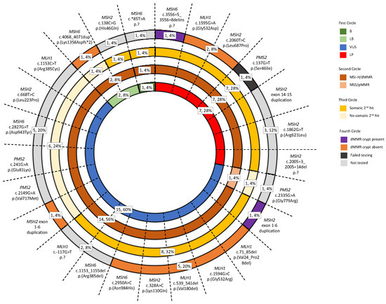 Sunburst diagram displaying the prevalence of the three Lynch-syndrome-associated features in the test group. The diagram incorporates the tumor sequencing and dMMR crypt/gland screening for determining pathogenicity against the ACMG/InSiGHT framework for MMR VUS included in the test group. Abbreviations: MMR, DNA mismatch repair; dMMR, DNA mismatch repair deficient; pMMR, DNA mismatch repair proficient; MSI, microsatellite instability; MSI-H, high levels of microsatellite instability; MSS, microsatellite stable; VUS, variant of uncertain clinical significance; LP, likely pathogenic; LB, likely benign; B, benign. * The symbol indicates the variant is located in the 3’ untranslated region in the case of MSH6 c.*85T>A and indicates the variant changes the amino acid to a stop codon in the case of MSH6 c.4068_4071dup p.(Lys1358Aspfs*2).