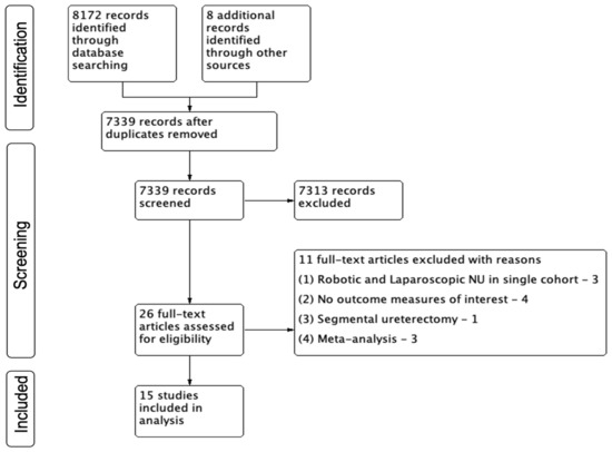 The review protocol was registered with PROSPERO 2023 CRD42023418801. The systematic review was performed in accordance with the Cochrane Guidelines and the Preferred Reporting Items for Systematic Reviews and Meta-Analyses (PRISMA) [6,7]. The bibliographic databases searched were Embase, Medline, Cochrane Library, Web of Science, CINAHL, British Nursing Index, LILACS, Biomed Central, BIOSIS, Scopus, and Amed. The search was conducted in May 2023. All studies comparing RNU with ONU and LNU were evaluated. See Supplementary File S1 for the search terms used for the strategies in this review.