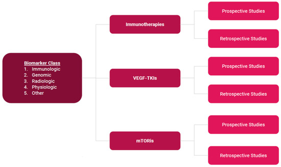 The purpose of this review is to systematically identify biomarkers that have the potential to diagnose, predict, prognose, and track therapeutic monitoring in ccRCC patients receiving systemic therapy with ICI, TKI, VEGFi, or a combination for treatment of adjuvant, neoadjuvant, and metastatic disease. This review organizes our findings first by marker class, then drug class, and finally paper methodology (Figure 1). Various types of biomarkers currently exist including immunologic, genomic, radiogenomic, and physiologic biomarkers. Other markers do not fit into any of these classes. A complete table of all biomarkers and associated data can be found in Supplementary Table S1. Additionally, the data collected in this paper can be visualized via Flourish at the following website: https://public.flourish.studio/visualisation/14189718/ (accessed on 22 July 2023).