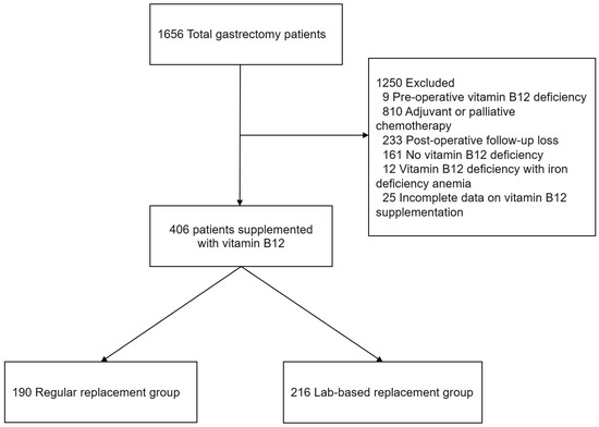 The TG patient demographics and clinicopathologic characteristics were evaluated. Among the 1656 TG patients, 406 patients who were treated with vitamin B12 replacement therapy were included based on the postoperative vitamin B12 deficiency (n = 315), high urine MMA level (n = 51), or symptoms related to vitamin B12 deficiency (n = 40). The patients with the following characteristics were excluded: pre-operative vitamin B12 deficiency (n = 9), adjuvant or palliative chemotherapy to rule out chemotherapy-induced peripheral neuropathy (n = 810), loss to follow-up within 2 years post-surgery (n = 233), no vitamin B12 deficiency during the follow-up period (n = 161), vitamin B12 deficiency with iron deficiency anemia (n = 12), and incomplete data on vitamin B12 replacement protocol (n = 25) (Figure 1).