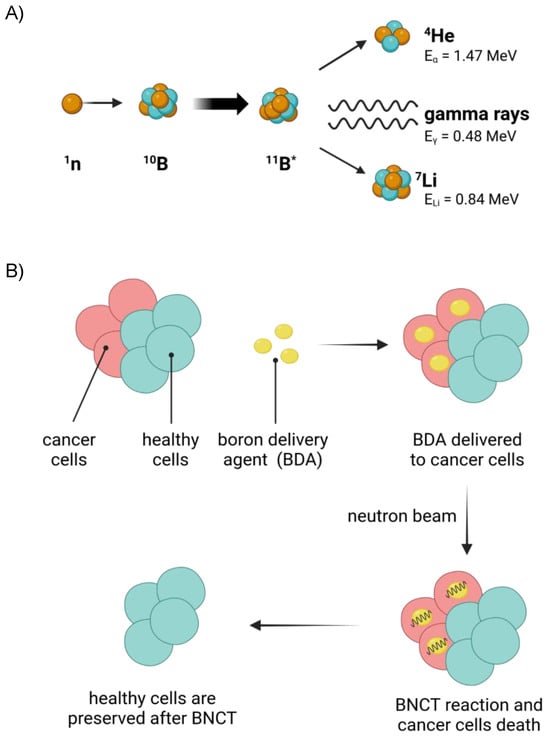 Schematic representation of (A) nuclear fission reaction on 10B atom and (B) BNCT mode of action. Images created with BioRender.com.