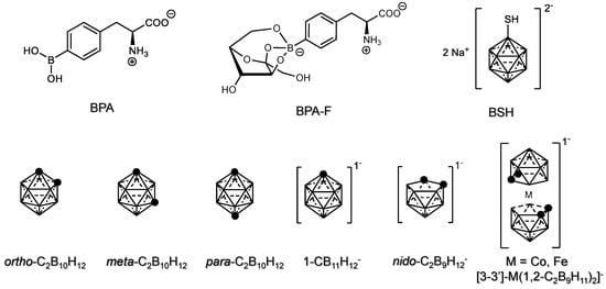Structures of borophenylalanine (BPA), BPA−fructose complex, mercaptoundecahydrododecaborate (BSH), closo-carborane (ortho-, meta-, and para-C2B10H12), closo-dodecaborate anion (1-CB11H12−), nido-carbonane anion (nido-C2B9H12−), COSAN ([3-3′]-Co(1,2-C2B9H11)2]−) and FESAN ([3-3′]-Fe(1,2-C2B9H11)2]−).