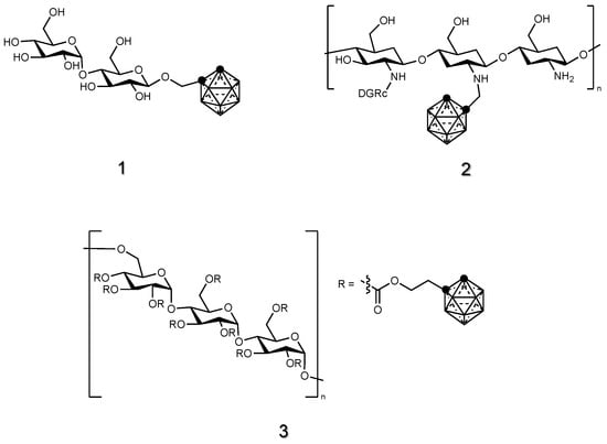 Despite the great effort reported in the literature regarding the synthesis and in vitro testing of carbohydrate derivatives of carboranes [73,79,80,81,82], the examples of such compounds tested in vivo are few [83,84,85,86]. Ortho-carboranyl glycosides of glucose, maltose and lactose were synthetized and tested in vitro for their toxicity toward C-6 rat glioma cells after thermal neutron treatment [87], but only the carboranyl maltoside compound was tested in vivo [88]. This carborane derivative 1 (Figure 3) displayed a boron uptake in murine induced tumors higher than BSH. Further in vivo tests involved a carborane derivatized with a chitosan oligosaccharide (COS) [84] 2 (Figure 3), which promoted the formation of nanoparticles, leading to carborane dispersion and inducing their phagocytosis by cells. Pullulan, a linear polysaccharide consisting of repeating units of maltotriose, has been covalently linked to ortho-carborane 3 (Figure 3) to obtain a safe and effective platform to deliver boron to fibrosarcoma through the formation of nanogels [85,86].
