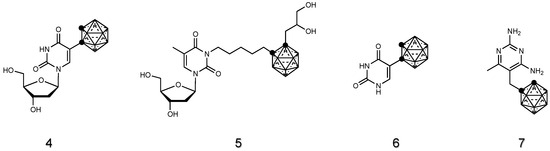 Nucleosides can be recognized and taken up by cells through nucleoside transporters present on the membrane. Thus, designing and synthesizing boron-containing nucleosides is justified for their potential to specifically accumulate in rapidly dividing tumor cells. By attaching these moieties to carboranes, the resulting conjugate can exploit the cellular uptake pathways already in place for nucleosides, facilitating the entry of carborane into cells. This can be particularly advantageous when targeting specific sites, such as cancer cells. For these reasons, various types of carborane-nucleosides derivatives [89], such as deoxyuridine [90,91,92,93], thymidine [94,95,96,97], uracil [98] and analogues [99], were synthesized and their potential in BNCT was assessed in vivo (4–7, Figure 4).