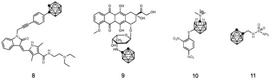 Structures of sunitinib- (8), doxorubicin- (9), nitroimidazole- (10) and sulfonamide-carborane (11) derivatives.