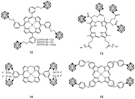 From the beginning of 1990, Miura and colleagues explored the potential of lipophilic porphyrins containing boron for in vivo applications [43,113,114,115,116,117,118,119,120,121,122,123,124,125,126,127]. Since then, significant progress has been made in the development of a series of porphyrin-based drugs [128,129], also complexed with metals such as Zn and Cu. The incorporation of these metal atoms into porphyrins can influence their biological activity and allow the use of radionuclides (i.e., 64Cu) for tracing and quantifying the boron distribution during in vivo treatment. The functionalization of the porphyrin scaffold led to the synthesis of several compounds tested for in vivo applications in BNCT, including CuTCPH [116,117,118,119,122,124,126,130], ZnTCPH [122], H2TCP [131,132,133,134,135] and BOPP [136,137], whose structures (12-13) are reported in Figure 6.