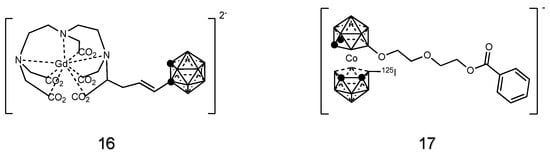 Pristine structures cannot be detected by several commonly applied imaging techniques. To perform real-time visualization or quantification of the carborane uptake and selectivity in tumors, several studies functionalized the cage by covalently binding imaging agents, such as fluorescent dyes, contrast agents or radiopharmaceuticals. These include the porphyrin derivatives discussed above. Other derivatizations were achieved with gadolinium-chelates [108,140,141,142] that are commonly used as contrast agents in magnetic resonance imaging (MRI), 16 (Figure 7), allowing the real-time localization of the carborane derivatives during in vivo experiments.