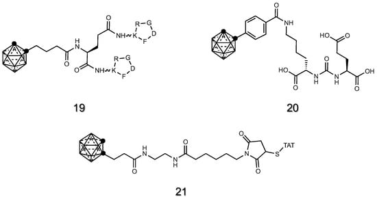Structures of cRGD- (19), PSMA- (20) and TAT (GRKKRRQRRRPQ)- (21) carborane derivatives.