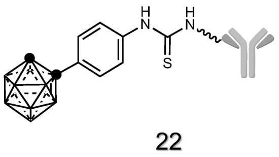 Antibodies (Abs) are proteins that recognize and bind to specific proteins/receptors present on the cells and have a crucial role in the development of targeted therapies [153]. It is evident that the conjugation of fragments or full antibodies to carboranes may be used to develop targeted strategies for BNCT. Examples are mT84.66, Mu-9 or 107-1A4 antibodies [145,146,154,155]. The mT84.66 antibody is a murine monoclonal antibody that targets a specific antigen called carcinoembryonic antigen (CEA). CEA is a protein that is normally produced during fetal development, but its expression decreases after birth. However, certain types of cancer, including colorectal, gastric, pancreatic and lung cancers, can lead to the re-expression of CEA. Mu-9 22 (Figure 10), a murine monoclonal antibody, specifically targets colon-specific antigen-p (CSAp), a tumor-associated antigen found in approximately 60% of colorectal carcinoma. 107-1A4, an IgG1 mAb, is selective for prostate cells [146].
