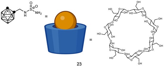 Cyclodextrins (CDs) can serve as carriers for carborane-based BDA [110], increasing the solubility of the drug by incapsulating it in their hydrophobic cavity. CDs are generally considered biocompatible and have a long history of use in pharmaceutical formulations. They have been extensively studied for safety, tolerability and compatibility with biological systems, making them suitable potential candidates for drug delivery applications. An example is the use of β-cyclodextrins to enhance the solubility of the sulfonamide derivative of carborane [110], as shown in 23 (Figure 11). Also, proteins can be considered supramolecular hosts for the delivery of hydrophobic moieties [156], behaving as “trojan horses” for theranostic applications [157]. The formation of supramolecular complexes between blood proteins and carboranes governs their pharmacokinetics and pharmacodynamics properties. Due to the presence of hydrophobic binding pockets, where endogenous or exogenous compounds can bind, proteins represent valuable delivery system platforms for carboranes [158,159].