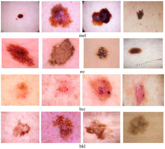 For this study, the dataset was composed of medical images collected from the HAM10000 [22] and ISIC Challenge 2019 [23] archives. Due to the imbalance between the number of images with the nv-type lesions and other types of lesions, approximately 20% of the nv images were randomly discarded. For the classes mel, bcc, and bkl, the dataset augmentation was achieved using [24]. Some examples with images from the four classes used are presented in Figure 1.