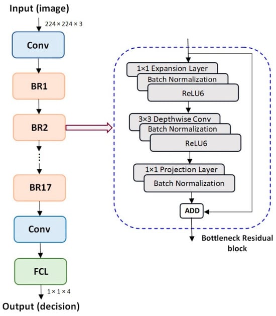 MobileNetV2 architecture (left) and Bottleneck Residual Block structure (right). Conv—convolutional layers, BR—Bottleneck Residual Block, FCL—Fully Connected Layer, ReLu—Rectified Linear Unit.