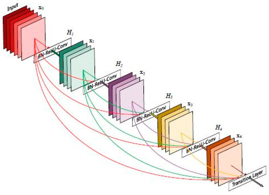 The characteristic of DenseNet [7] is that each layer obtains information from all previous layers by concatenation and provides all feature maps (information) to the following layers (Figure 3). Thus, the input image passes successively through several layers of convolution, obtaining the feature maps.