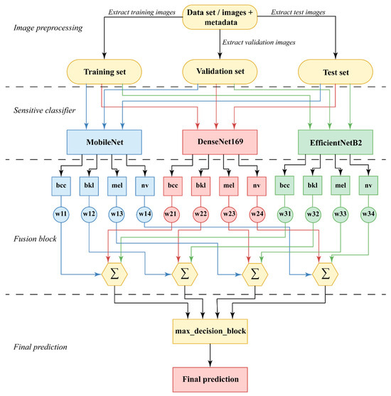 The system has four sections: (a) image preprocessing, in which data is also separated for the three stages of operation (training, validation, and testing); (b) sensitive classifier, having three networks with a classifier function; (c) fusion block, to obtain decisions on each branch and summing up the partial predictions for each class; and (d) final prediction, for selecting the maximum value among the four partial predictions/class. For this task, the matrix of partial predictions P (6) corresponding to each NN, and each class (12 elements) is calculated. This matrix will be multiplied member by member with the weight matrix (7). The weight matrix is also 3 × 4 in size. The elements of the weight matrix W (wi,j) are calculated for each network i (i = 1, 2, 3) and each class j (j = 1, 2, 3, 4) and correspond to the F1 score F1ij, as in (1). The network correspondence is 1—MobileNet, 2—DenseNet169, and 3—EfficientNetB2. The class correspondence is 1—bcc, 2—bkl, 3—mel, and 4—nv.