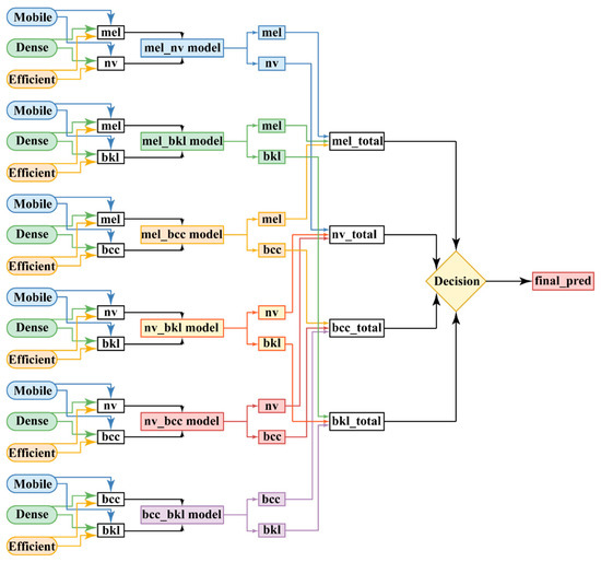 The binary models of the three networks are grouped into branches corresponding to the considered pairs: mel_nv, mel_bkl, mel_bcc, nv_bkl, nv_bcc, and bcc_bkl. Then, the tree is reduced to four branches, mel_total, nv_total, bcc_total, and bkl_total, from which the decision is taken by maximum selection. They are evaluated by the sum of the corresponding binary models (12)–(15). The decision is taken by the maximum from the previous values.