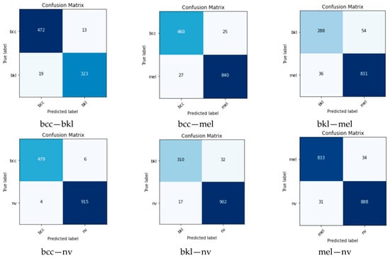 Considering separately the binary ensembles of the three NN, for the four classes mentioned in the previous chapter, it can be observed that the results are very good for the six branches of the final ensemble and better than each individual ensemble (Table 5). The accuracy of the global branches was calculated according to the confusion matrices in Figure 9. Large differences between the branches are also observed. For example, on the bek—mel branch, the lowest accuracy is obtained (92.56%) and on the bcc—nv branch, the highest accuracy is obtained (98.28%).