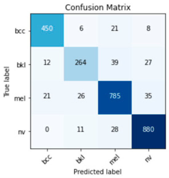 The final ensemble for classifying the skin lesion in one of the four classes has a weaker result than the binary branches, which was expected because the number of classes increased from two to four. Thus, from the global confusion matrix (Figure 10), F1 scores were evaluated for the four classes (Table 6), with an average accuracy of 91.04%. Table 6 compares the two performances for Ensemble Model 1 and Ensemble Model 2. For all classes, the statistical indicators of the model with subsets of binary models are better than those of Ensemble Model 1. Table 6 shows the number of images from the dataset in each class for the testing phase. The results per class differ quite a lot (F1 score), with bkl being the weakest and for nv the best.