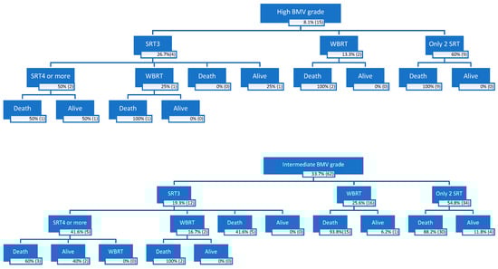 Patient outcome by BMV grade after SRT2. SRT2: Second Session of Stereotactic Radiotherapy; SR3: Third Session of Stereotactic Radiotherapy; SRT4: Forth Session of Stereotactic Radiotherapy.